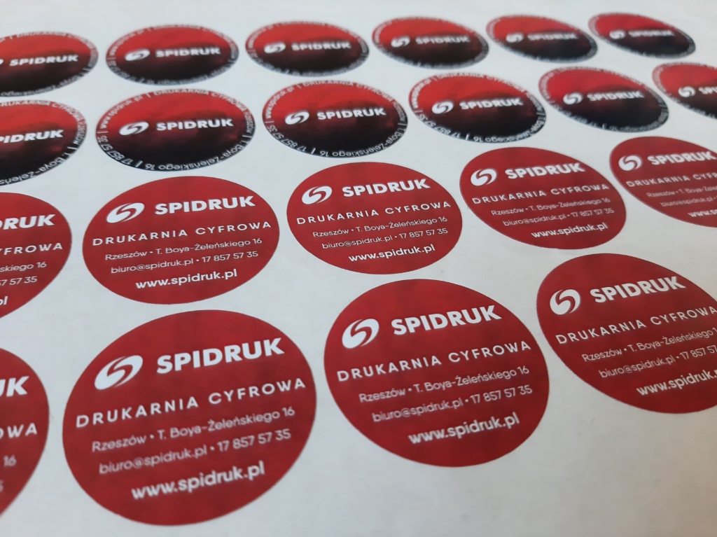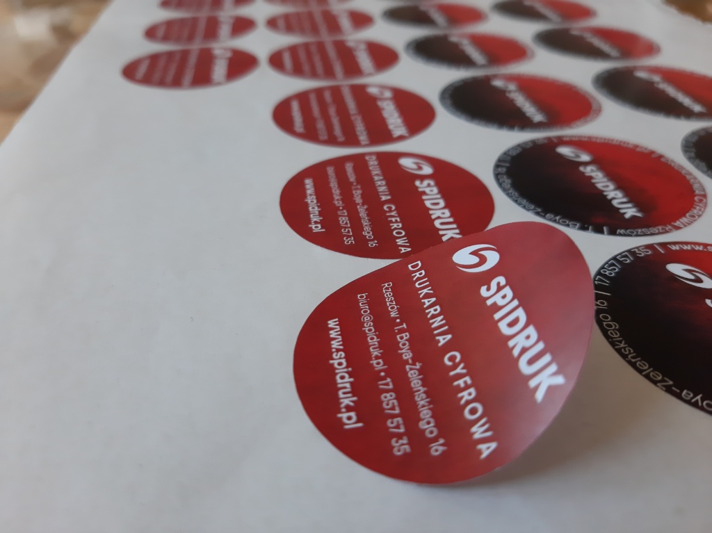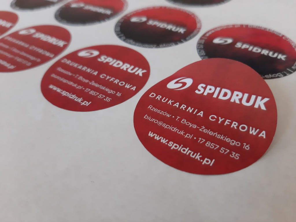 Naklejki reklamowe okrągłe wykorzystujemy również we własnym zakresie – często brandujemy nimi opakowania, w których wydajemy materiały. W tym wypadku postawiliśmy na naklejki reklamowe o średnicy 4 cm. Wydrukowaliśmy je na papierze samoprzylepnym.